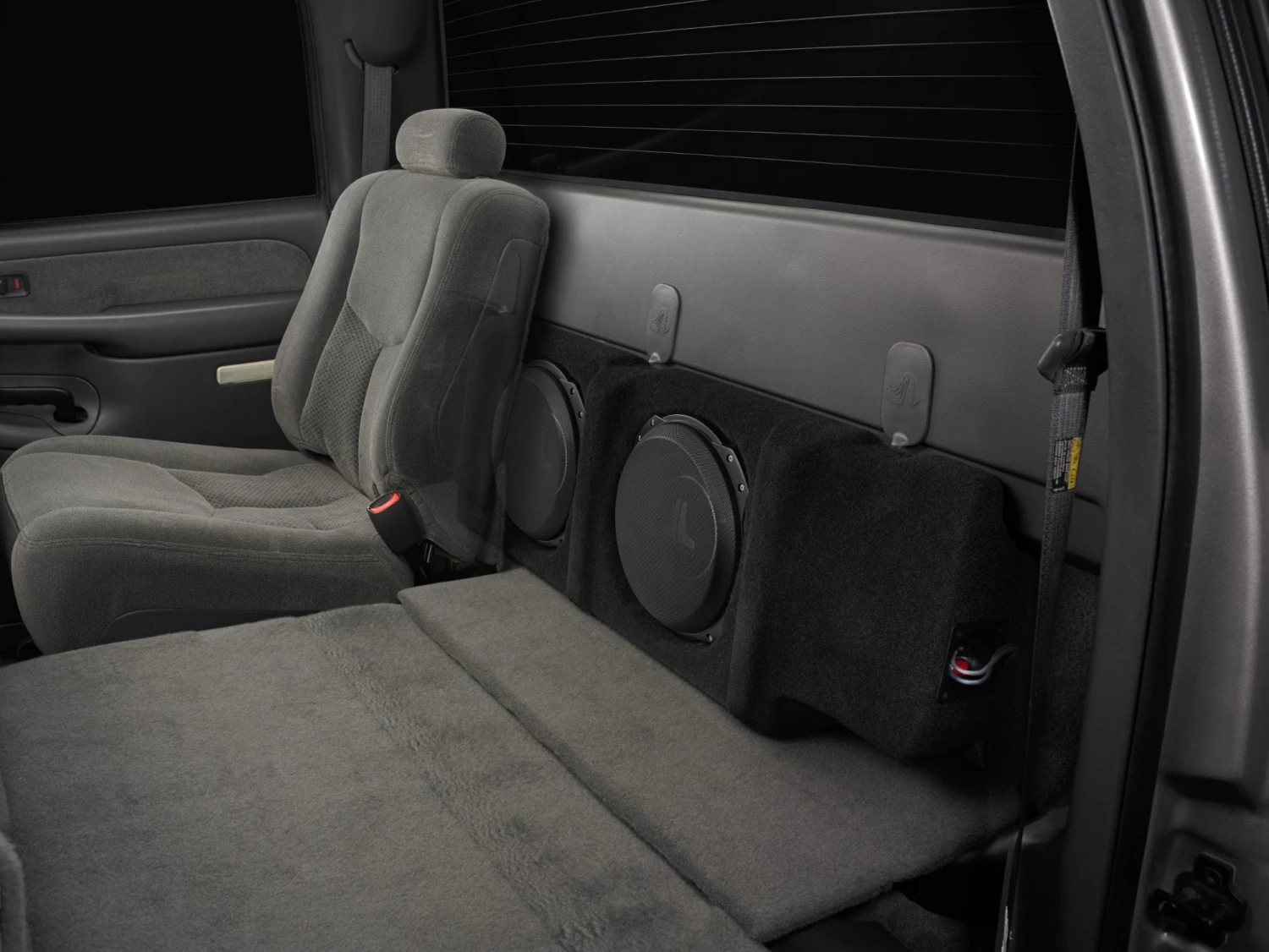The massive GM Crew Cab trucks offer limousine-like rear seat room and comfort, accomplished by effectively utilizing almost every cubic inch of interior space. Our Stealthbox® for these big trucks slips behind the rear seat and features twin 10TW3 subwoofers for absolutely stellar sub-bass impact and quality. Nobody will ever know it’s there, until you turn it up.